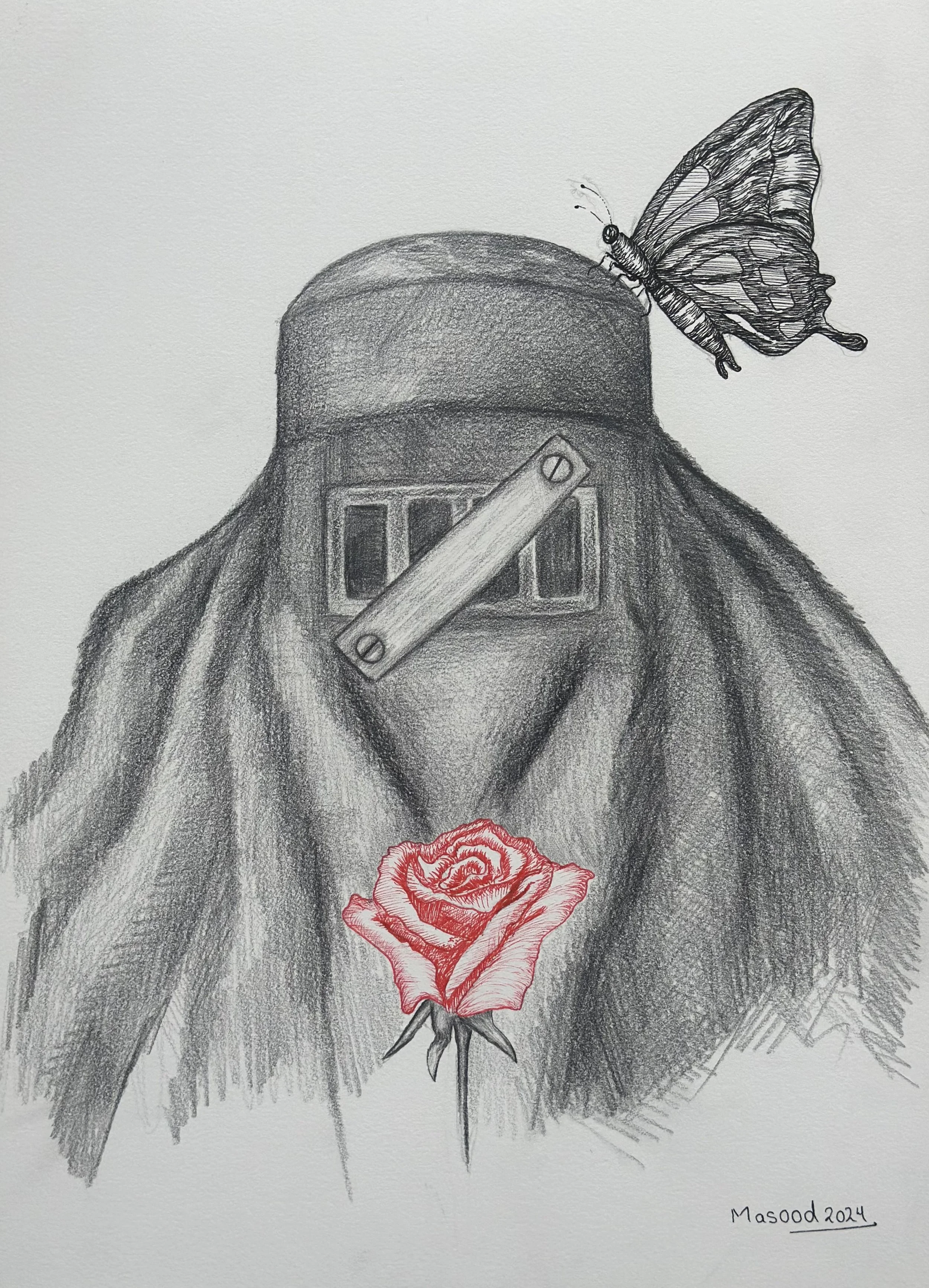 This work carries the weight of silence and the strength of survival. The barred veil suggests confinement, yet signs of life break through fragile, fleeting, and quietly powerful. Softness appears where it should not, and color rises where none is expected.
