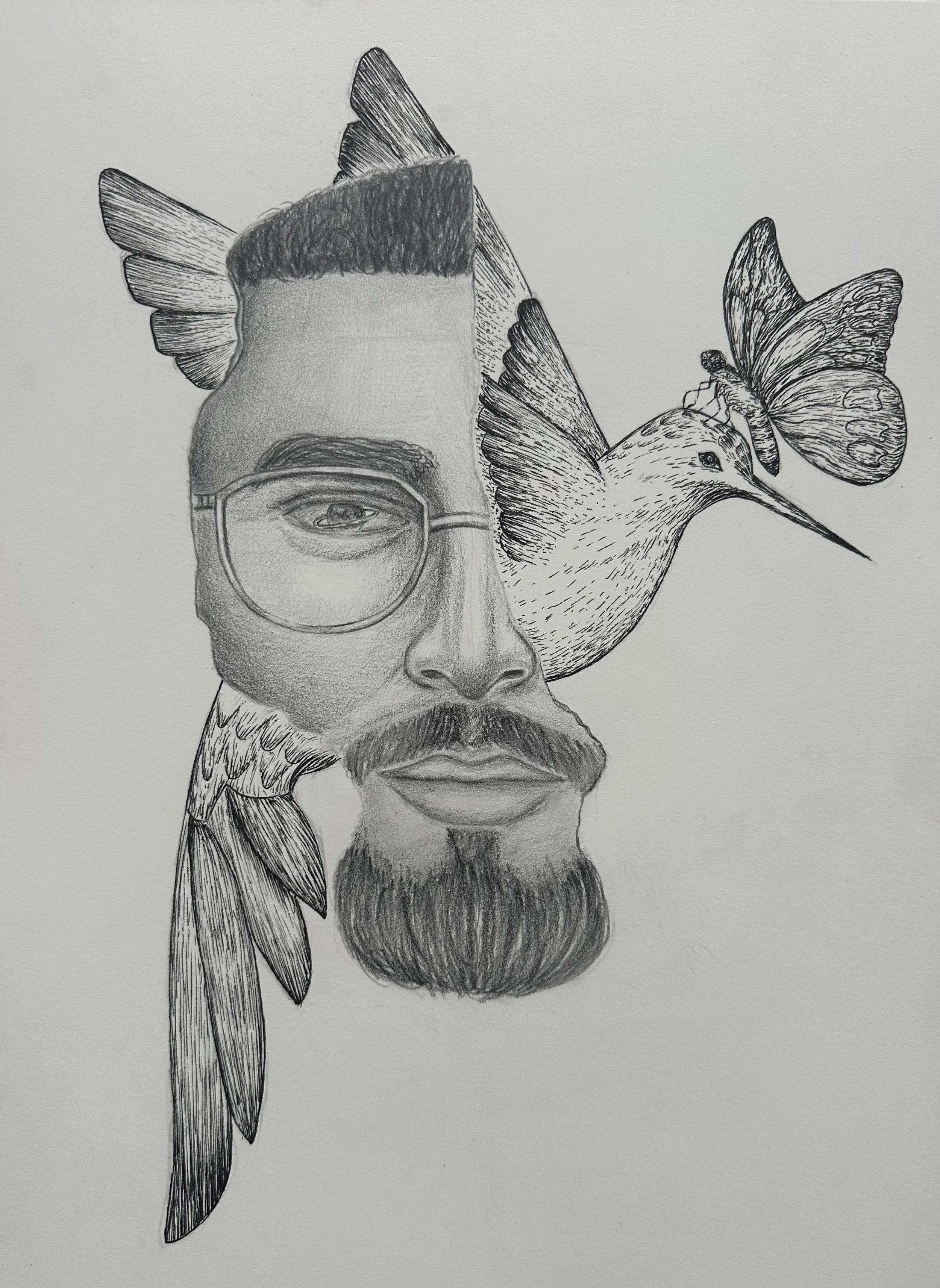 This piece carries a part of my story. Growing up in Afghanistan, I often turned to nature as a place of peace and refuge. In this drawing, my portrait merges with wings, a hummingbird, and a butterfly symbols of transformation, freedom, and fragile beauty. Together, they speak of how the human spirit and the natural world are inseparable, each beginning where the other ends.